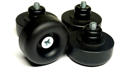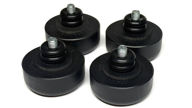 These 2.5" wide hard rubber feet fit the Mofi Fender, StudioDeck, UltraDeck, and MasterDeck turntable models.